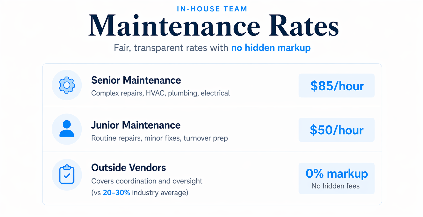 At Franceschini Realty, we keep maintenance costs low by using our in-house maintenance technicians. They handle most repairs at a rate of $50-85/hour, which is significantly lower than the $75-125/hour most contractors charge.